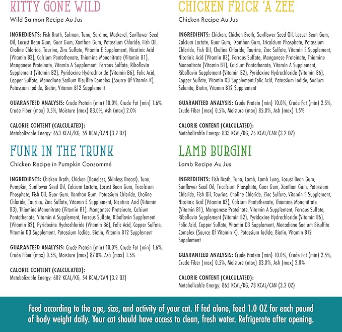 • The Kitchen Cuties Variety Pack includes 6 cans each of: Kitty Gone Wild, Lamb Burger-ini, Chicken Frick 'A Zee, and Funk in the Trunk.