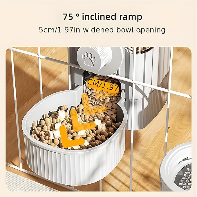 • Automatic Supply Design: Dog feeder automatically dispenses food and water by gravity, so that your dog can enjoy fresh and clean food and water at any time. And pet feeder can ensure that your cat can maintain a feeling of fullness when you go out or work. The opening of automatic cat feeder is designed with a 45 degree slope, and it has a large width of up to 2 inches. When your cat empties food bowl, the food will be dispensed smoothly and don’t be stuck.